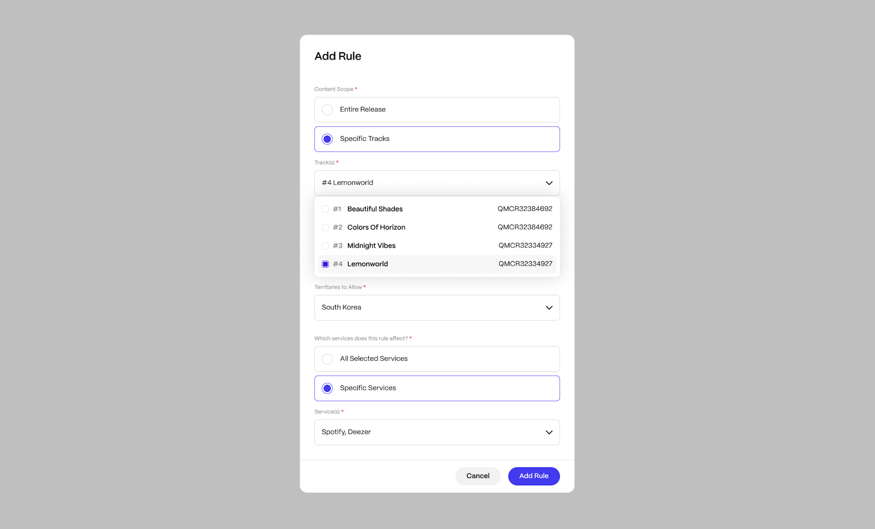 When a rule is scoped to a Specific Track, only that track is affected. All other tracks continue to follow the release-level availability unless separate rules are added.